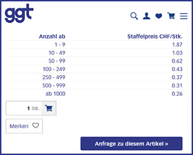 Wir erweitern unser Webshop-Sortiment kontinuierlich - derzeit sind ausschliesslich Standardprodukte online bestellbar. Dafür sind ab sofort kleinere Mengen erhältlich. Da wir nicht in Verpackungseinheiten liefern, können Sie Ihre Wunschmenge frei wählen. Für Bestellungen unterhalb einer bestimmten Mindestmenge fällt ein Mindermengenzuschlag von CHF/Euro 20.- an.