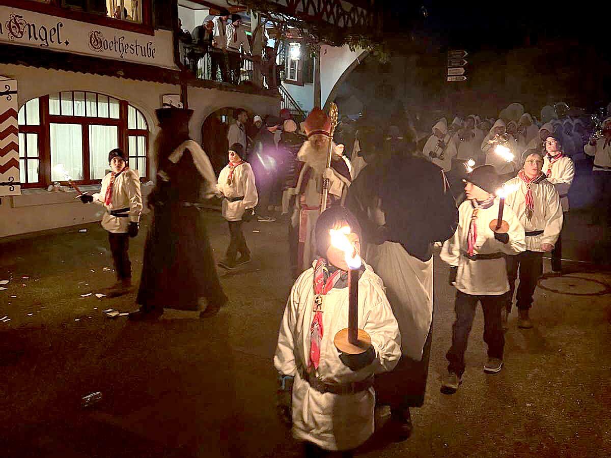 Die Klausjagd erwies sich als eindrückliches und intensives Kulturerlebnis. In der Dunkelheit zogen die Klausen mit ihren kunstvoll bemalten Iffelen durch die Gassen, begleitet vom rhythmischen Klang der Trycheln. Dieser archaische Lärm hat eine lange Tradition, denn er soll die bösen Geister des alten Jahres vertreiben und den Winter einläuten. Die streng choreografierten Abläufe, das Spiel von Licht und Schatten sowie die spürbare Konzentration der Teilnehmenden vermittelten eindrucksvoll, wie tief dieser Brauch in der Region verwurzelt ist.